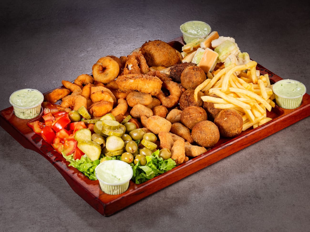 200g camarão, 200g isca de peixe, 200g de lula, 6 unidades de bolinho de siri + fritas + salada (alface e tomate) + pão.