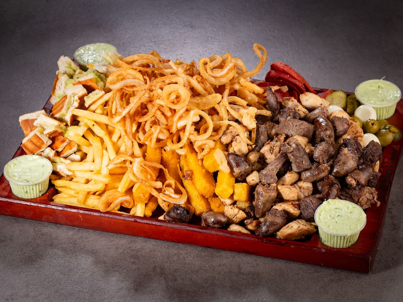 200g camarão, 200g isca de peixe, 200g de lula, 6 unidades de bolinho de siri + fritas + salada (alface e tomate) + pão.