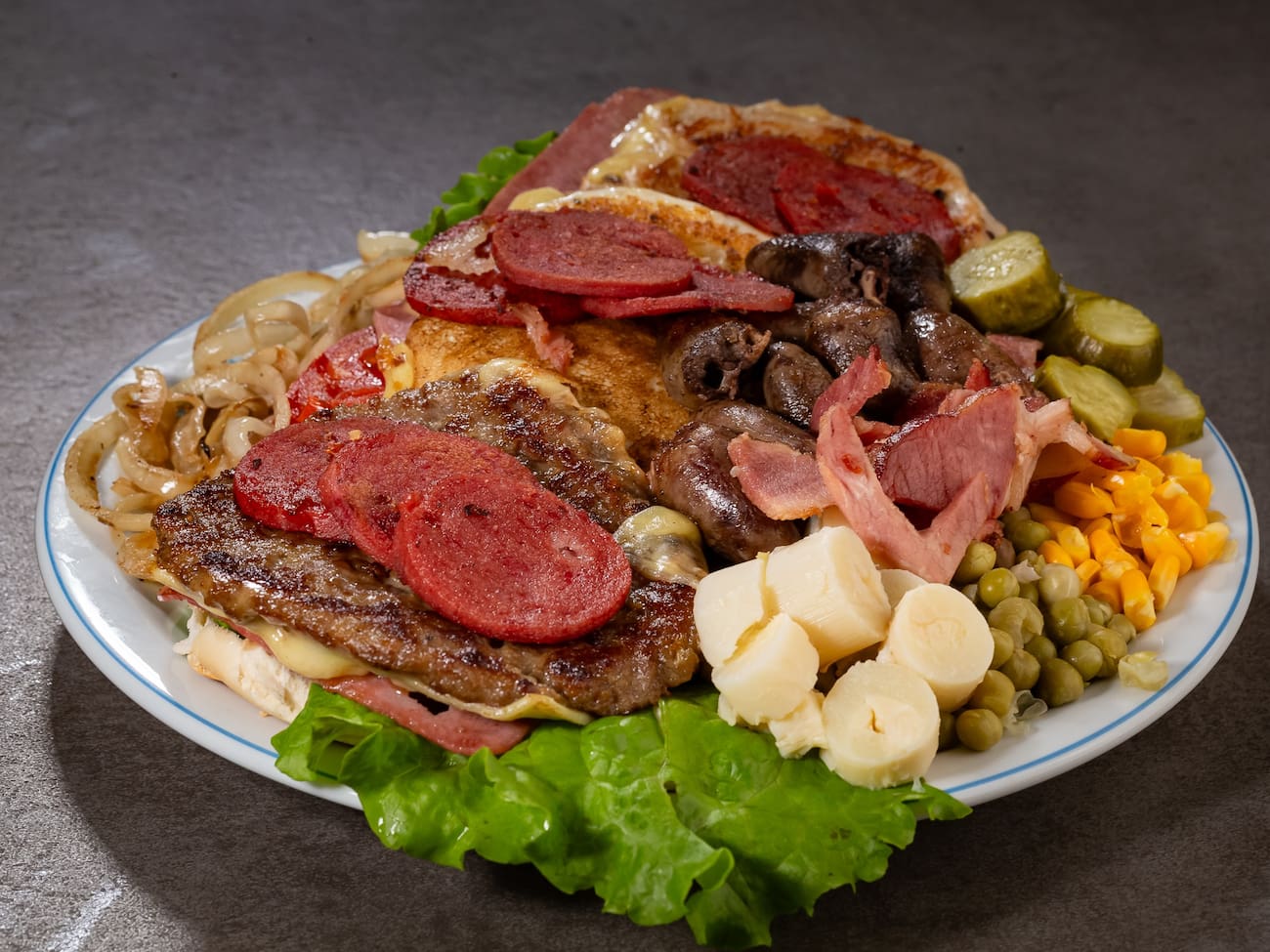 Pão, hambúrguer, peito de frango, coração, calabresa, bacon, ovo, cebola, pepino, palmito, queijo, presunto, milho, ervilha, tomate, alface e batata palha e maionese caseira