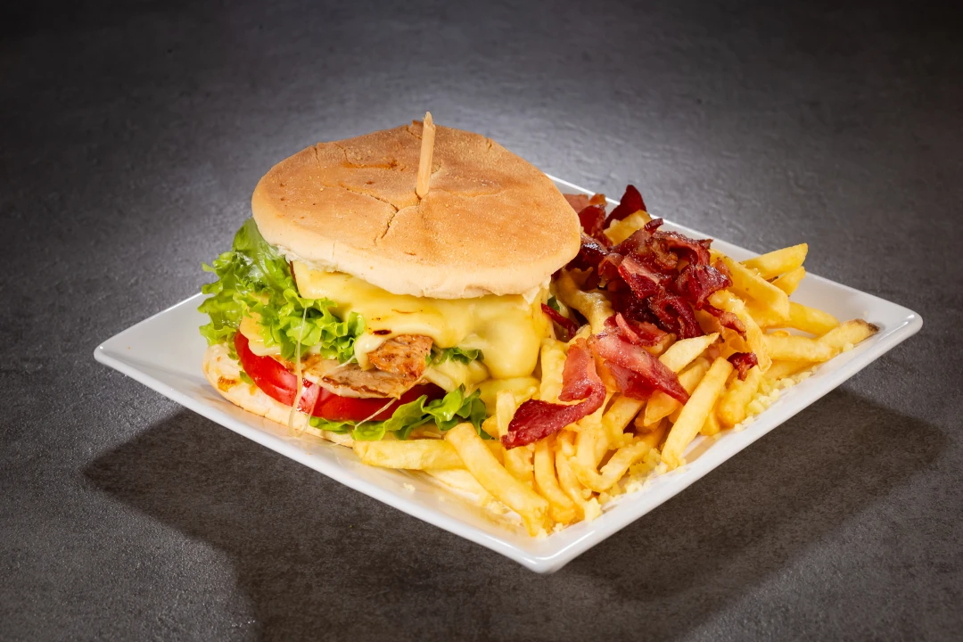 Pão argola, dois filés de frango, queijo, alface, tomate, 1/2 fritas gratinada e maionese caseira.