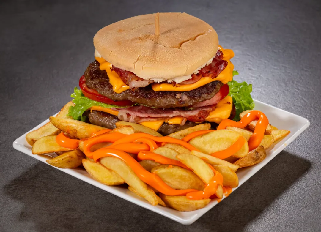 Pão, dois hambúrgueres 200g, queijo cheddar, bacon, tomate, alface e batata frita rústica e maionese caseira.